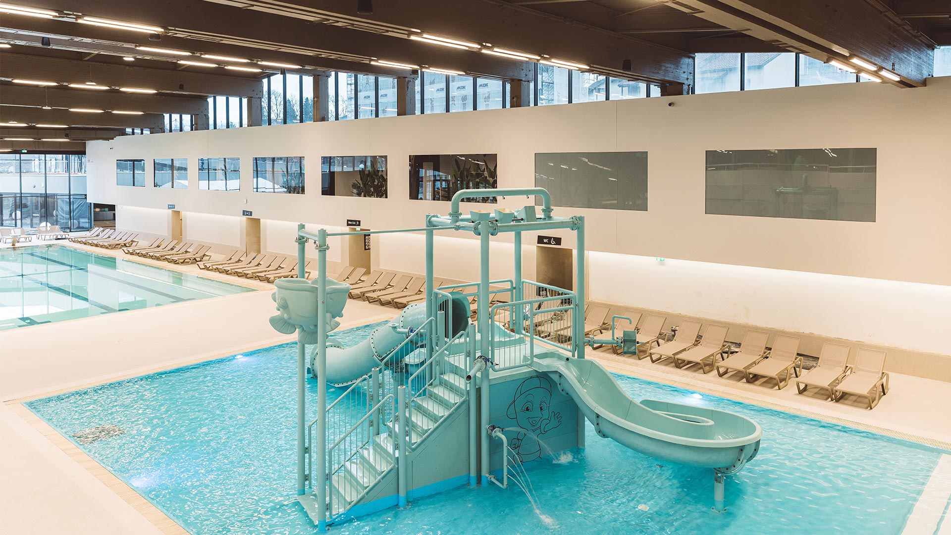 Der Wasserplanet erstreckt sich über eine Fläche von 15.000 m2 und bietet zahlreiche Wasserattraktionen im Innen- und Außenschwimmbad.