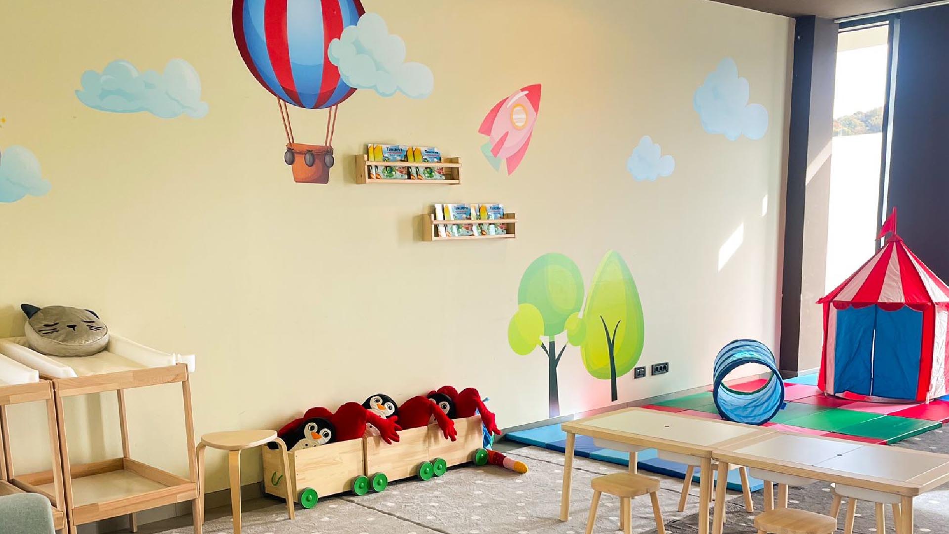 The children's playroom on two floors contains a super slide that connects the two floors of the playroom. In the upper part, there is a place for creative workshops, and in the lower part, there are climbing rocks, a gallery for watching cartoons and interactive wall toys.